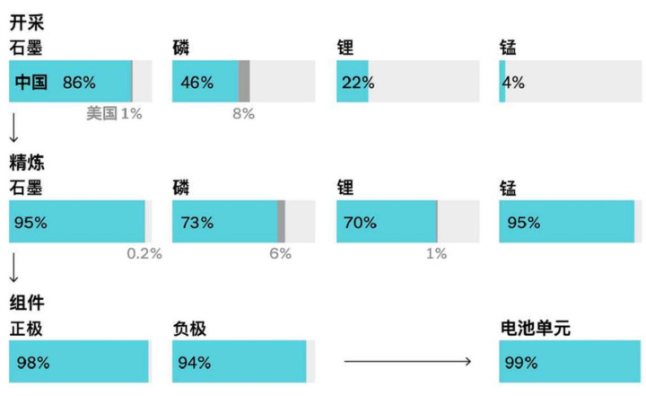 目前中国占据全球锂矿资源的半壁江山,镍矿、钴矿、稀土矿的全球份额均超过6成,尤其是电池生产不可或缺的精炼石墨,中国几乎实现100%垄断。